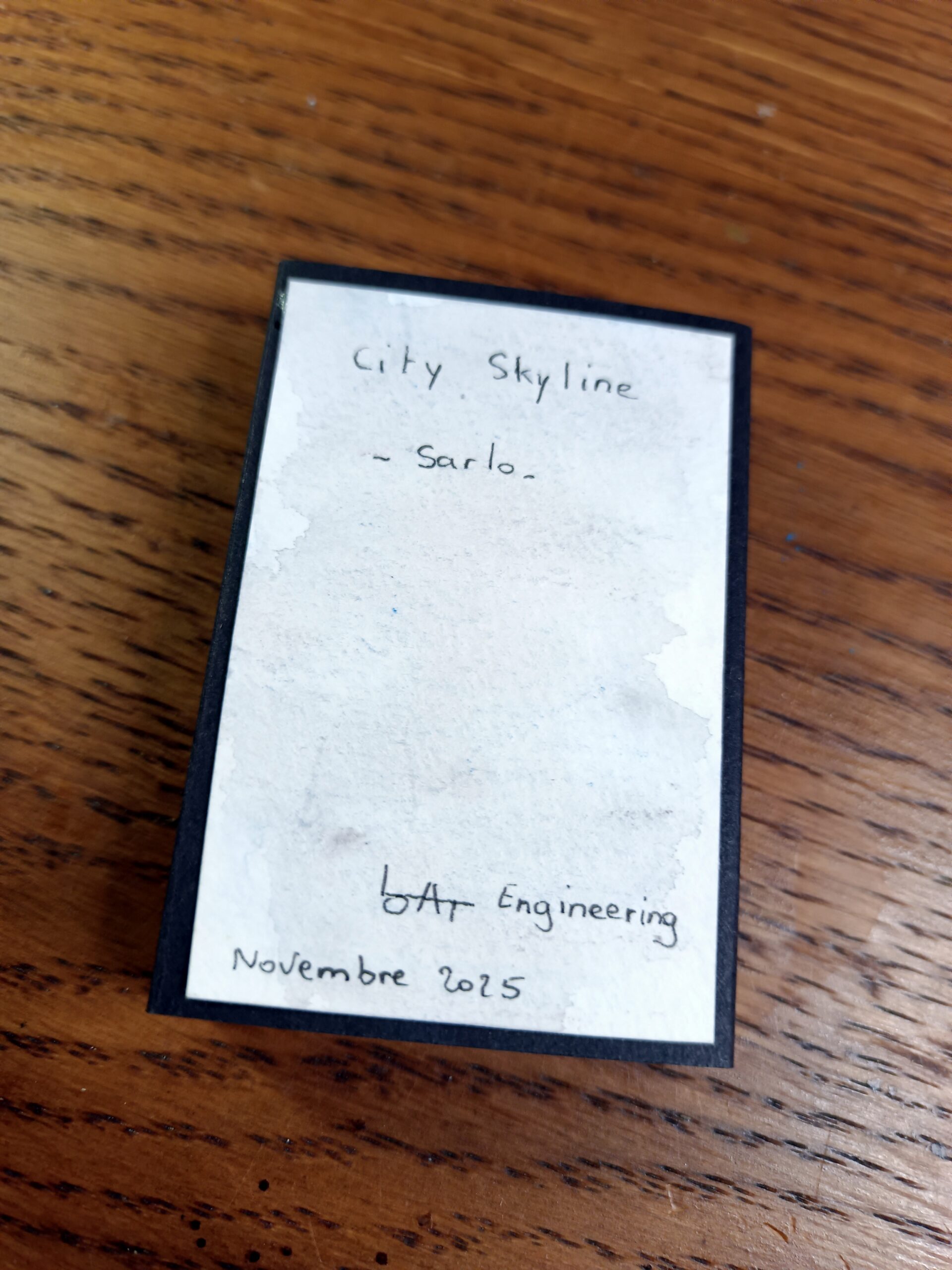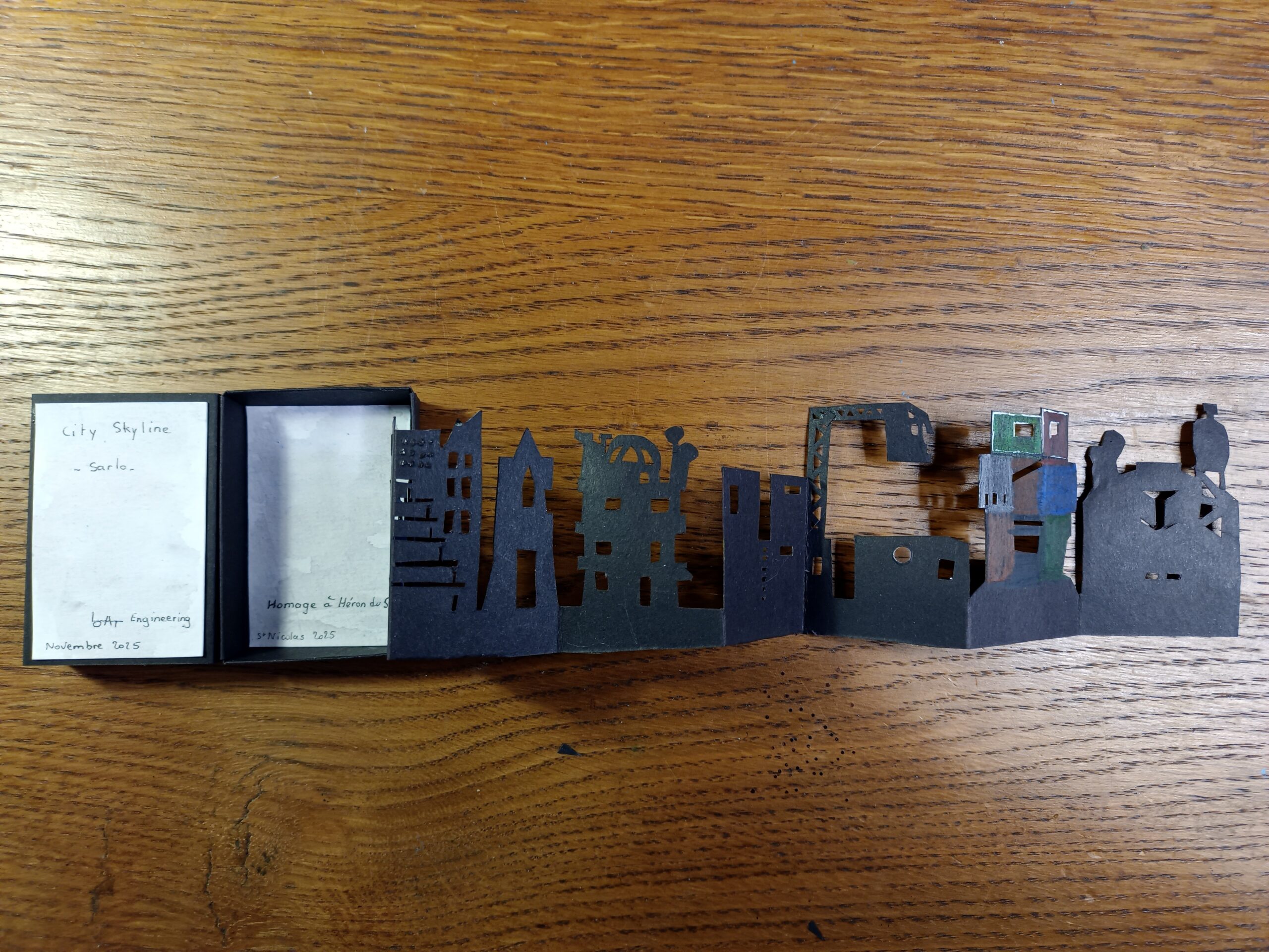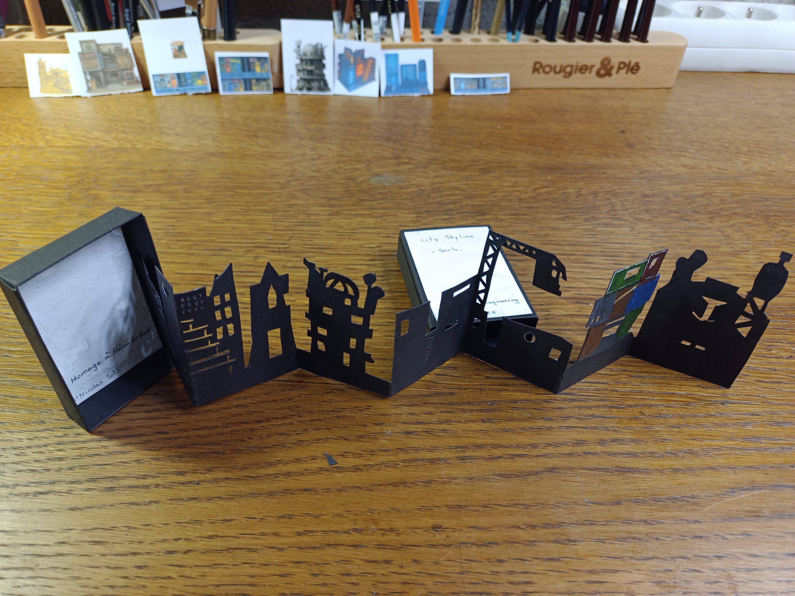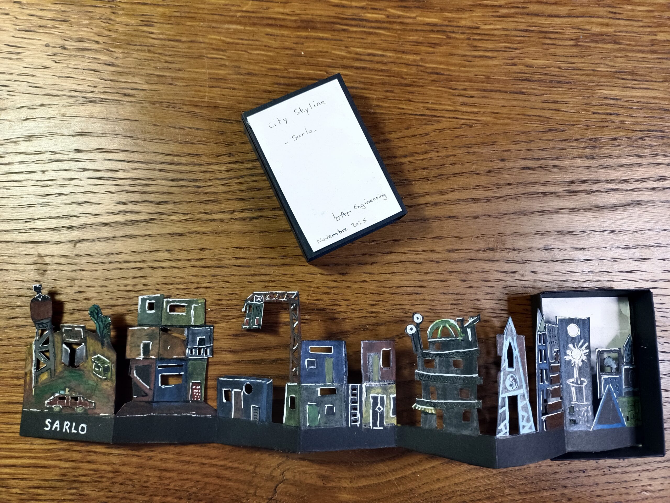 Chaque élément a été découpé à la main puis peint à l’aquarelle et au crayon aquarellable. Le pliage en accordéon permet de déployer la scène comme un fragment miniature de ville, tout en conservant l’esthétique singulière de Sarlo. Le travail sur les volumes, les percées et les superpositions restitue l’esprit des maquettes d’origine, dans une version compacte et transportable ^^.