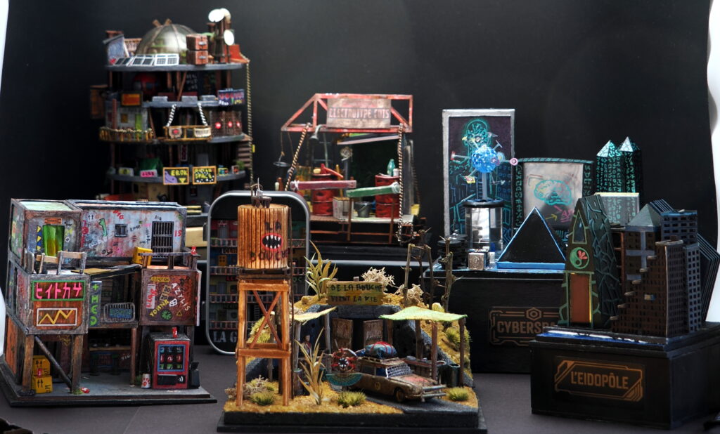 Cette boîte est une édition spéciale dédiée à l’univers de Sarlo, créé par Héron du Sud. Elle reprend plusieurs éléments emblématiques de ses dioramas : architectures fragmentées, couleurs patinées, structures industrielles et silhouettes verticales qui composent ce paysage urbain foisonnant.