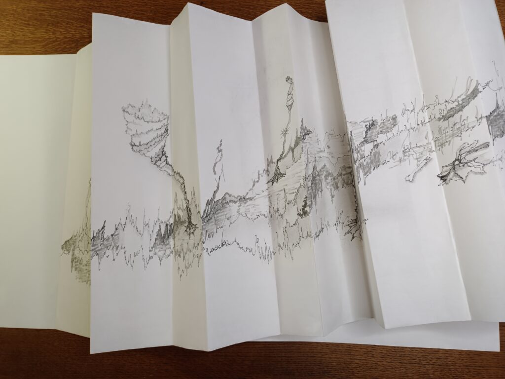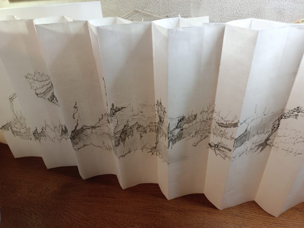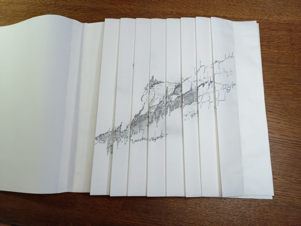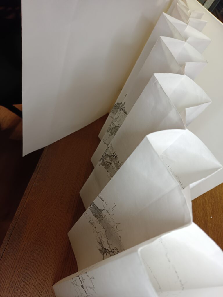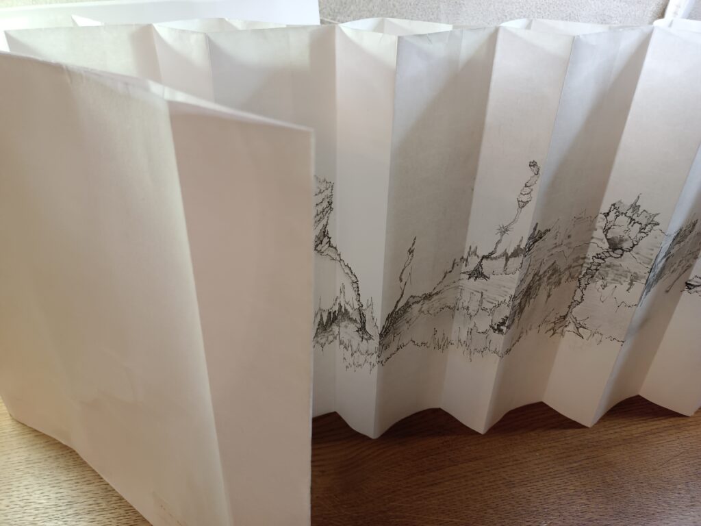 Livre d’artiste entièrement fait main en papier Xuan (46 g/m², 35 cm de haut), dessiné recto–verso au graphite et feutres Pigma Micron en niveaux de gris.