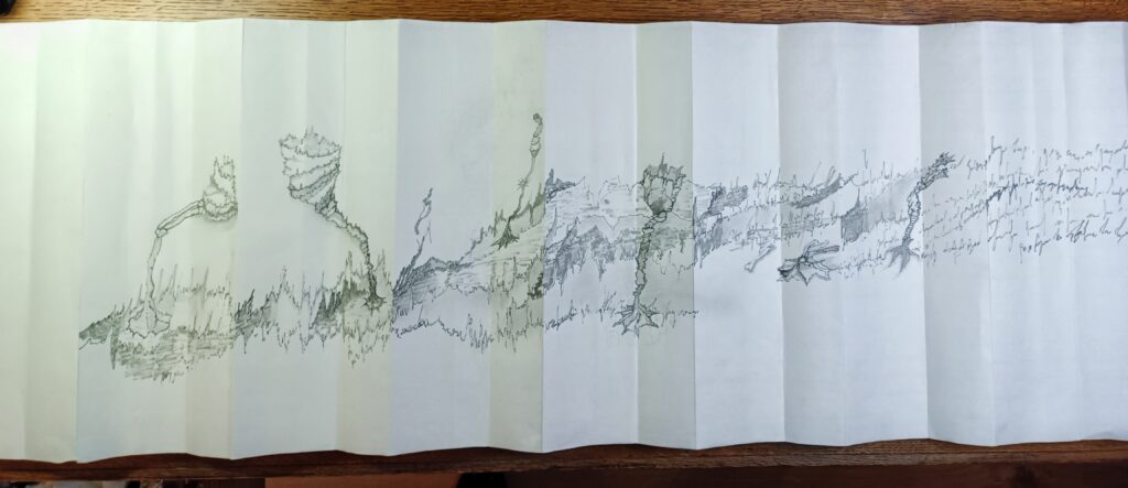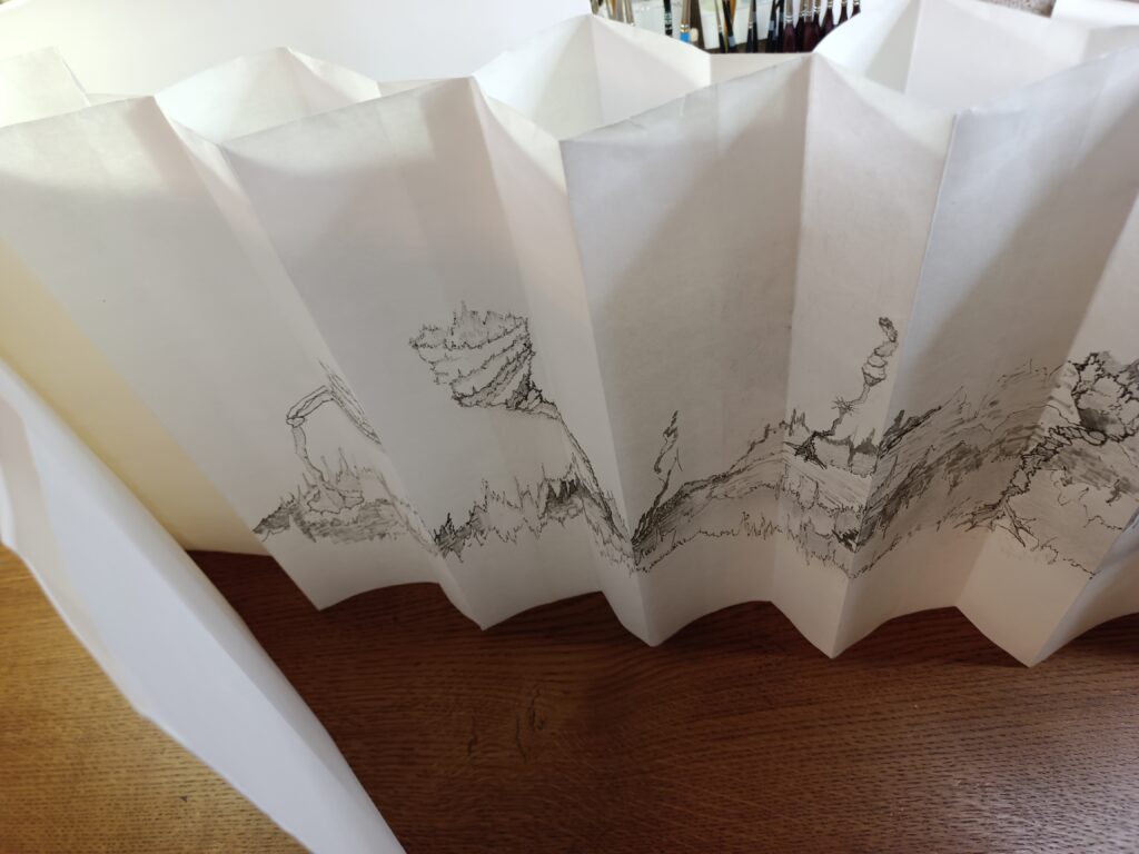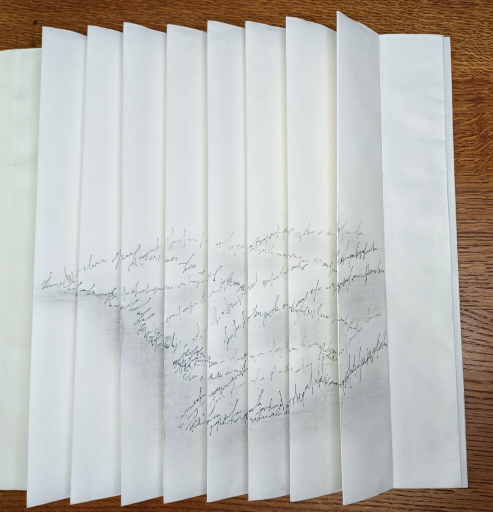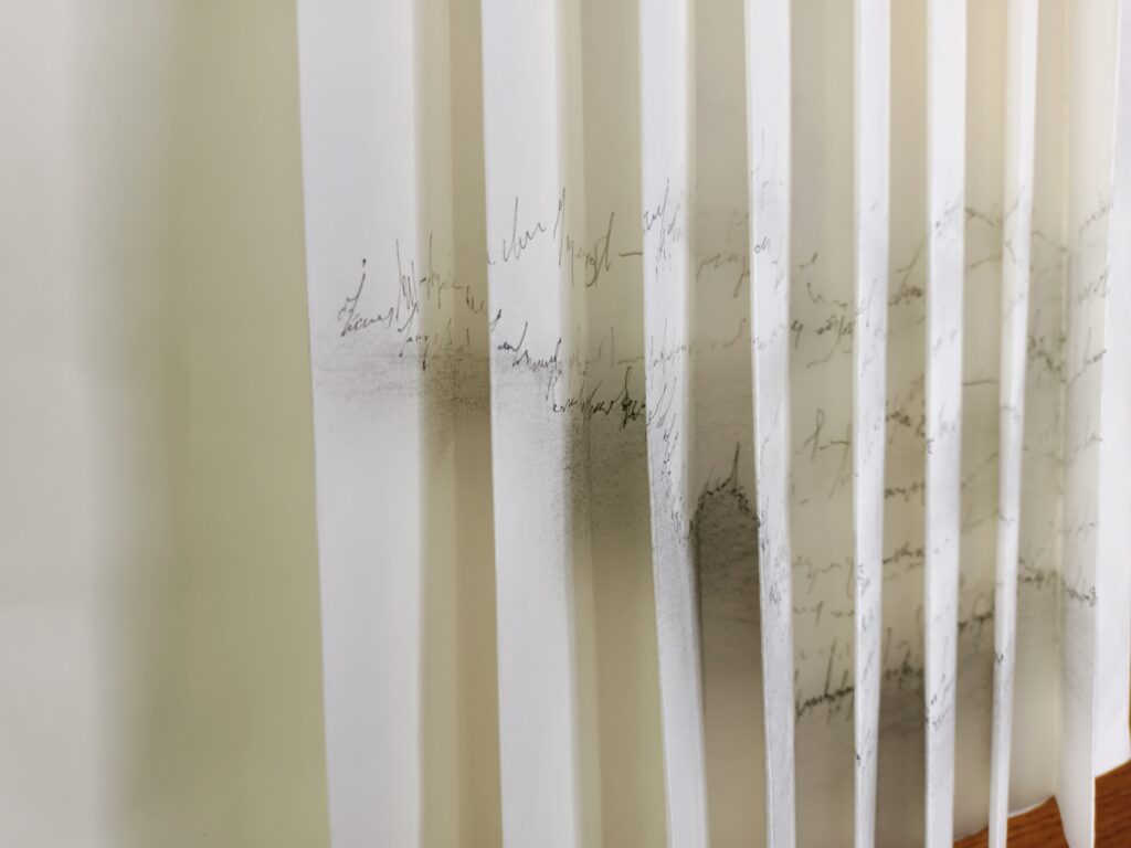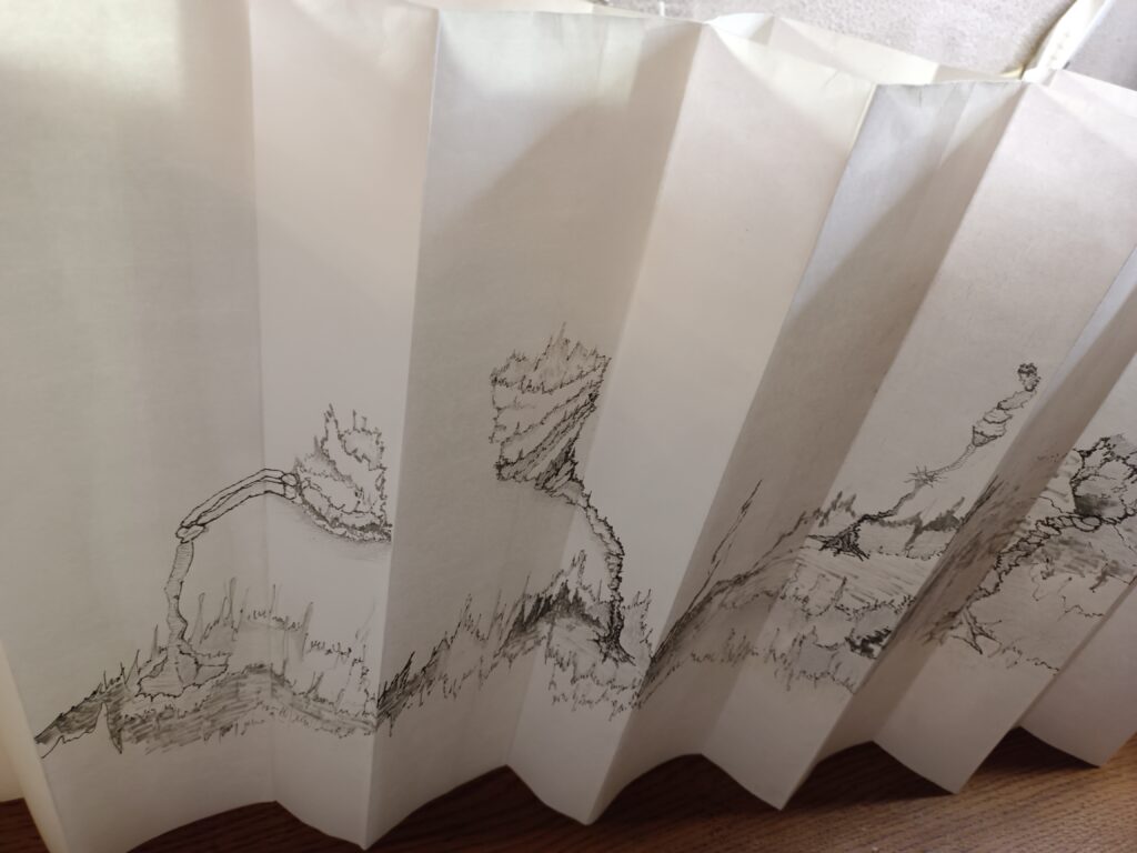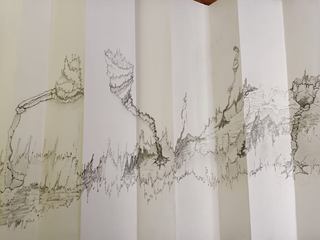 Livre d’artiste entièrement fait main en papier Xuan (46 g/m², 35 cm de haut), dessiné recto–verso au graphite et feutres Pigma Micron en niveaux de gris.