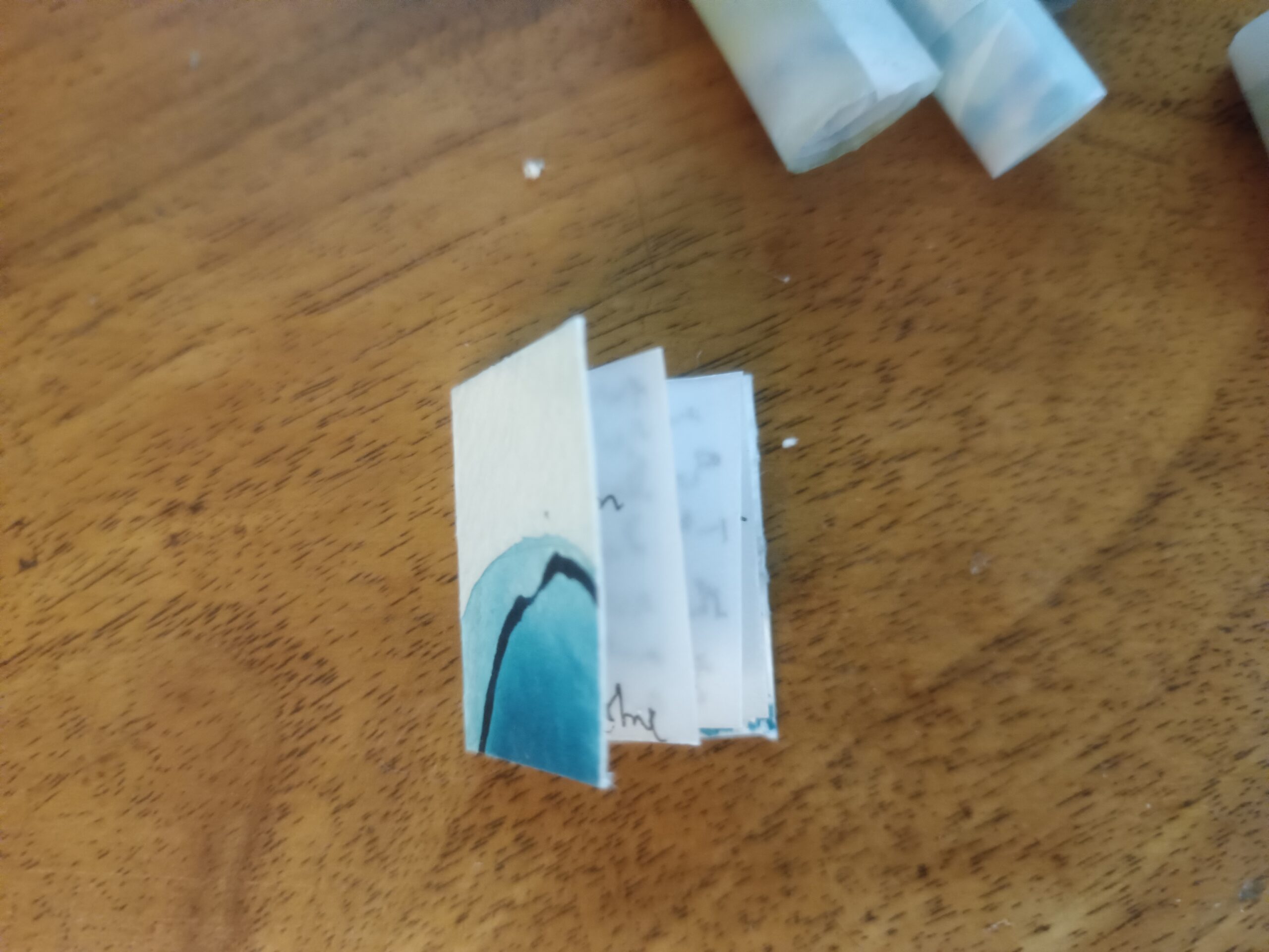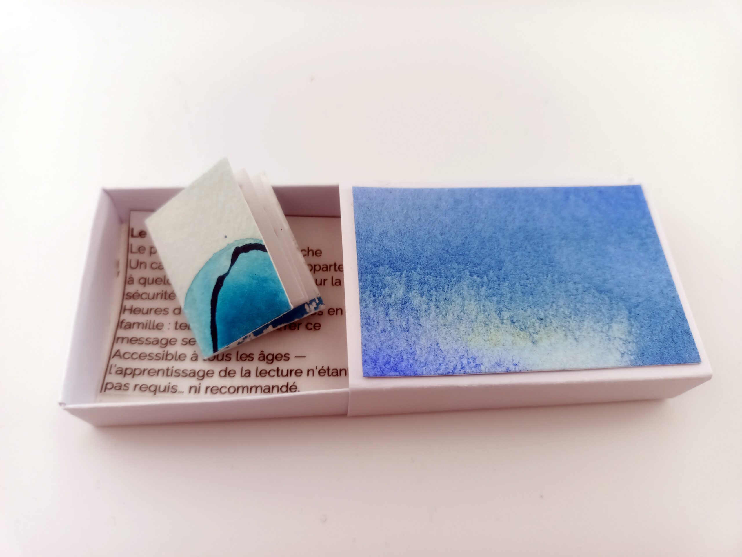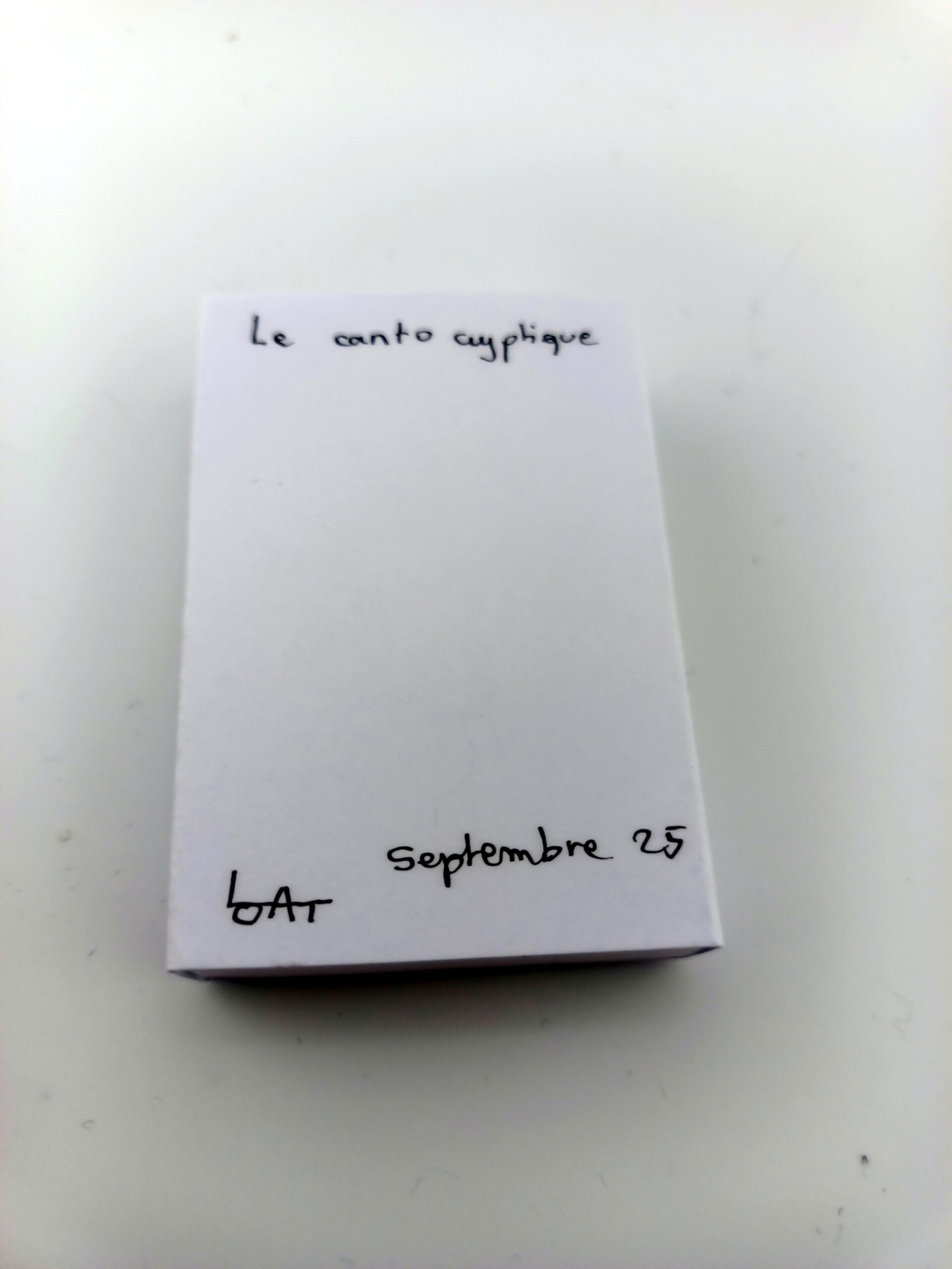 Papier aquarelle pour la couverture, papier calque pour l’intérieur, rempli d’une écriture asémique.