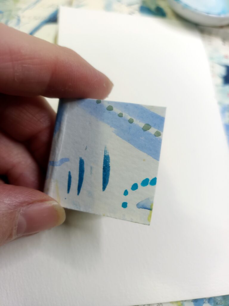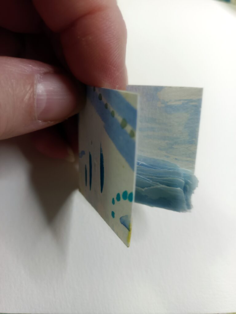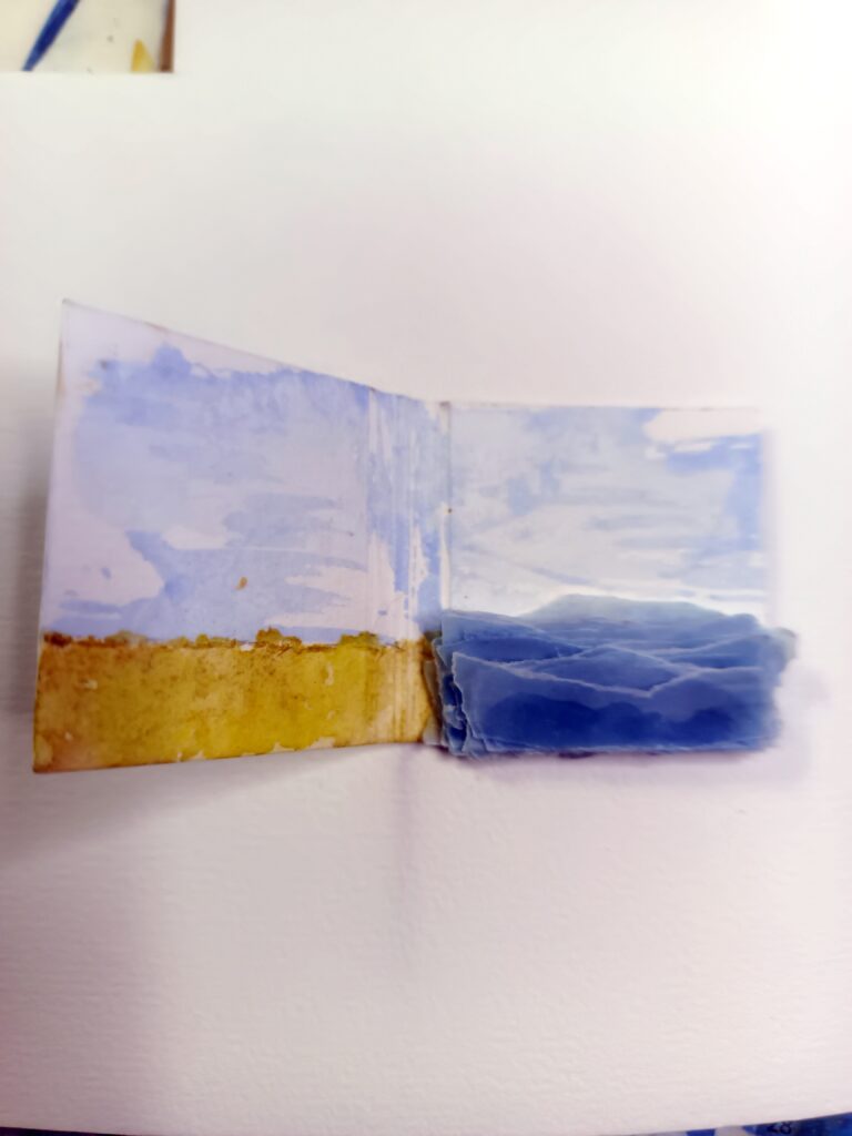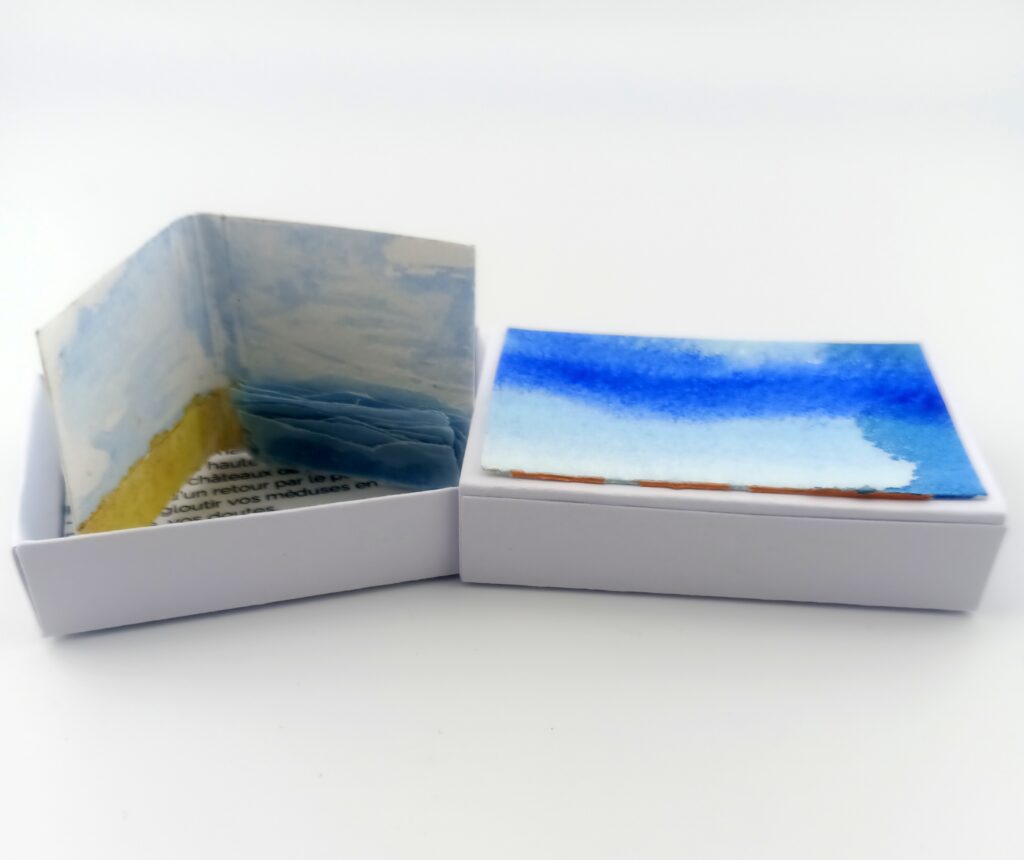 Papier aquarellé pour la couverture ; collage intérieur en strates de calques aquarellés, suggérant les vagues s’échouant sur le sable.