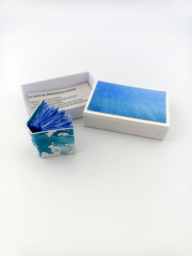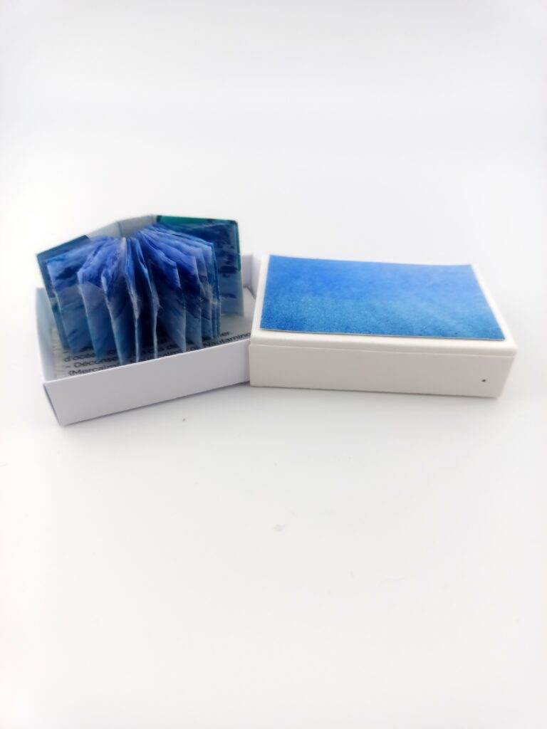 Accordéon en papier aquarellé, saturé de couches superposées de bleu, blanc et turquoise, rappelant une mer démontée.