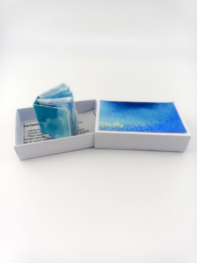 Papier aquarellé pour la couverture, pages intérieures en calque aquarellé et intercalaires de Tengucho, dont les fibres blanches créent des effets de brume et de courant.