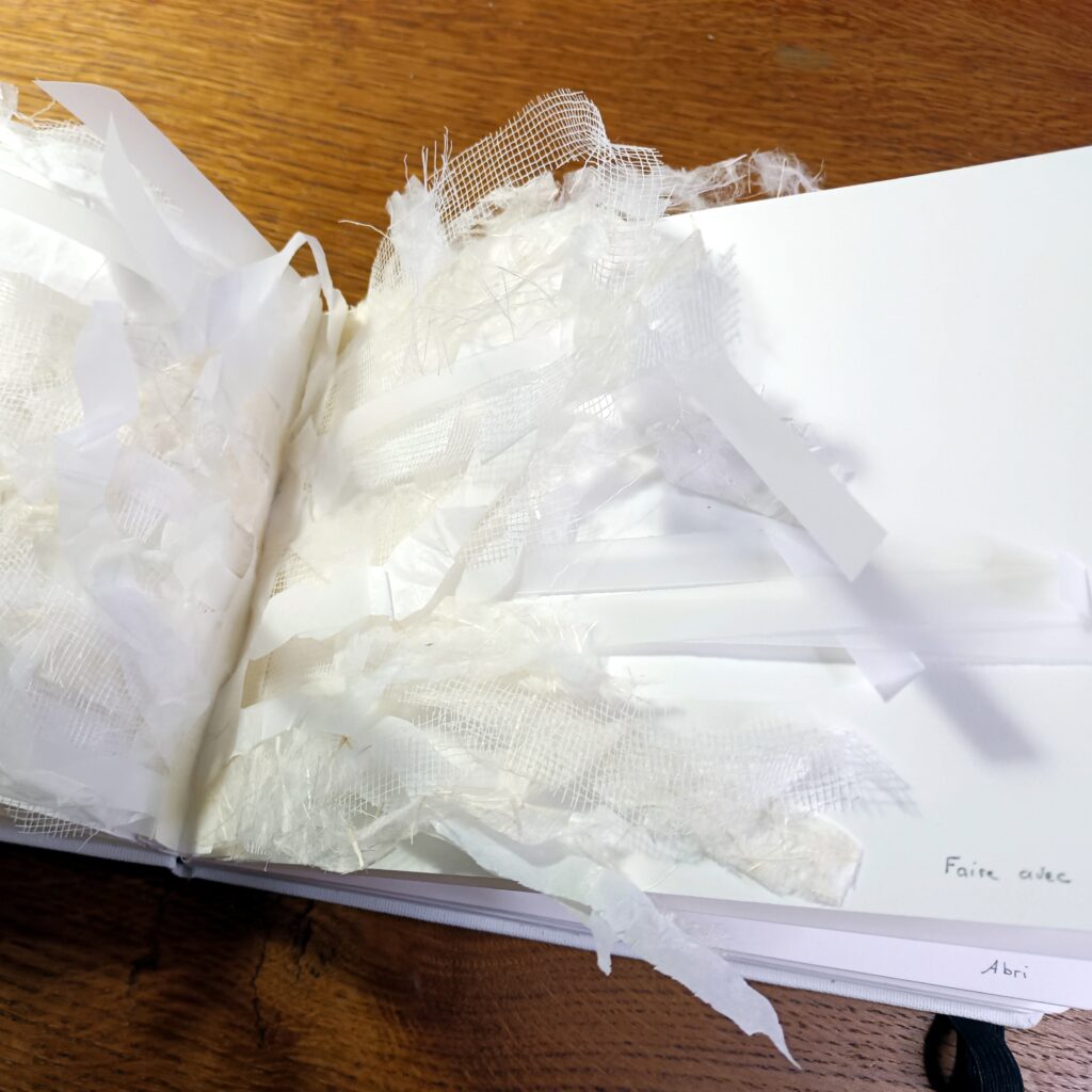 Petit à petit, je me suis sentie chez moi dans ce carnet. Ces bouts de papiers, qui avaient déjà eu une vie avant celle-ci, me rappelaient d’autres créations, d’autres moments heureux. Page après page, je me construisais une safe place. Une cabane.