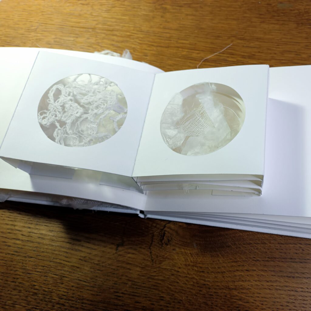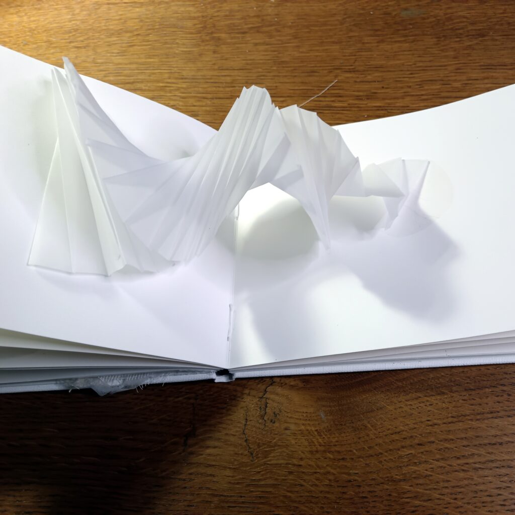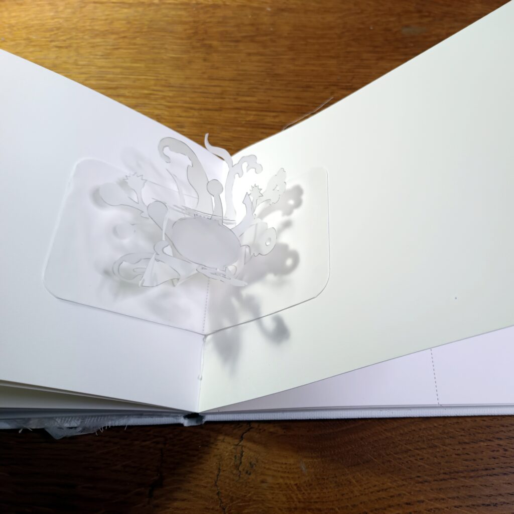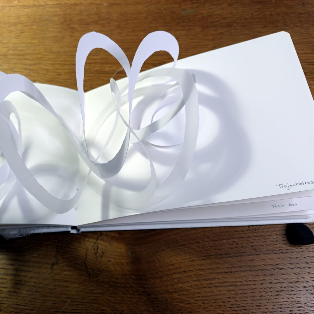Cartel : Au travers de cinq pop-ups, d’un collage original et de 8 textes qui les accompagnent, j’ai souhaité faire coexister des volumes abstraits et des textes qui leur répondent sans chercher à les expliquer.